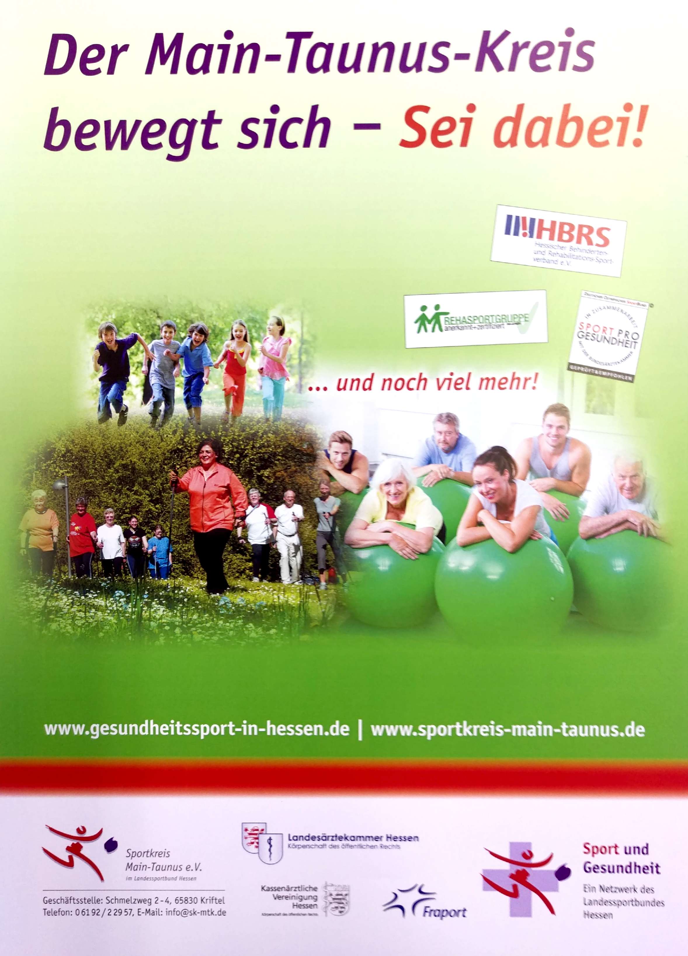 und Ansprechpartner vor. Wie schon zuvor werden die aktuellen Broschüren an alle Rathäuser des Main-Taunus-Kreises, an niedergelassene Ärzte, Apotheken sowie an die Kliniken des Main-Taunus-Kreises, das Klinikum Frankfurt Höchst und an alle Filialen der Nassauischen Sparkasse und Taunus Sparkasse verteilt.Unterstützt wird das Projekt „Gesundheit und Bewegung“ von zahlreichen Ärzten aus dem Main-Taunus Kreis, die mit Hilfe des Rezeptes für Bewegung diese qualitätsorientierten Bewegungsangebote empfehlen. Kooperationspartner sind unter anderem der Main-Taunus-Kreis, das Gesundheitsamt des Main-Taunus-Kreises, der Landessportbund Hessen, die Kassenärztliche Vereinigung Hessen und der Turngau Main-Taunus.