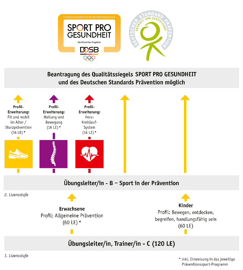 Hierbei bietet der Landessportbund Hessen Ausbildungen im Bereich Prävention nebst Aufbauprofilen an. Bei der Präventions-Ausbildung können die Übungsleiter die Lizenz ÜL-B Sport in der Prävention (2. Lizenzstufe) erwerben und sich anschließend durch die Aufbauprofile spezielles Wissen aneignen. Die Aufbauprofile teilen sich in folgenden Katigorien auf,