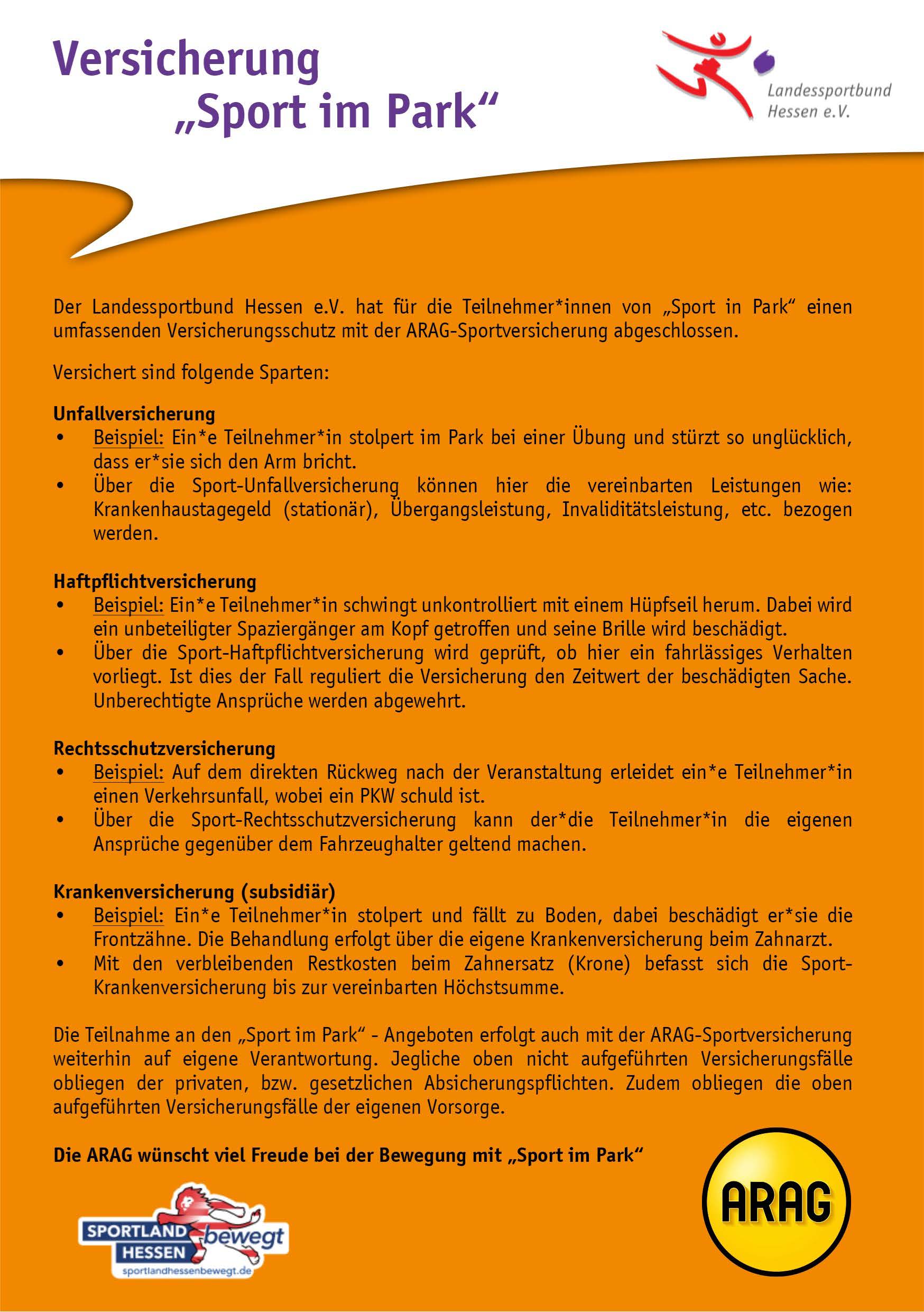 Wichtiger Hinweis: Eine Teilnahme an den "Sport im Park"- Angeboten ist für alle Interessierten kostenfrei. Die Teilnahme an den Angeboten erfolgt freiwillig unter eigener Verantwortung, d.h. die Vereine oder der lsb h übernehmen keine Haftung. Eine Veranstaltungsversicherung für die Teilnehmenden wurde abgeschlossen (Weitere Infos - bitte auf das Dokument rechts klicken).